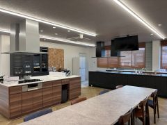 建て替えには同社が大切にしてきた「お客さま」と「社員」への思いが込められている。2階の「医生ケ丘キッチンスタジオ」には最新ガスコンロをそろえ、各メーカーの比較実演や使い方講座、試食を通じて製品の魅力を「体験」で伝える。取締役営業本部長の菅野一孝さん(49)は「実際に触れて機能を確かめてもらうことで、暮らしに合った選択をしていただける場にしたい」と語る。直近の展示会は380組が来場するほど好評で、今後も四半期ごとの開催を予定。使い方講座は2か月に1回実施し、購入前後の不安解消や使いこなしを後押ししていく。